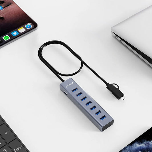 Mbeat 7-Port USB Hub | Dual USB-A & USB-C Connector Silver | 2-in-1 connector | enabling quick charging of smartphones, tablets, and other USB devices | supporting modern and legacy devices