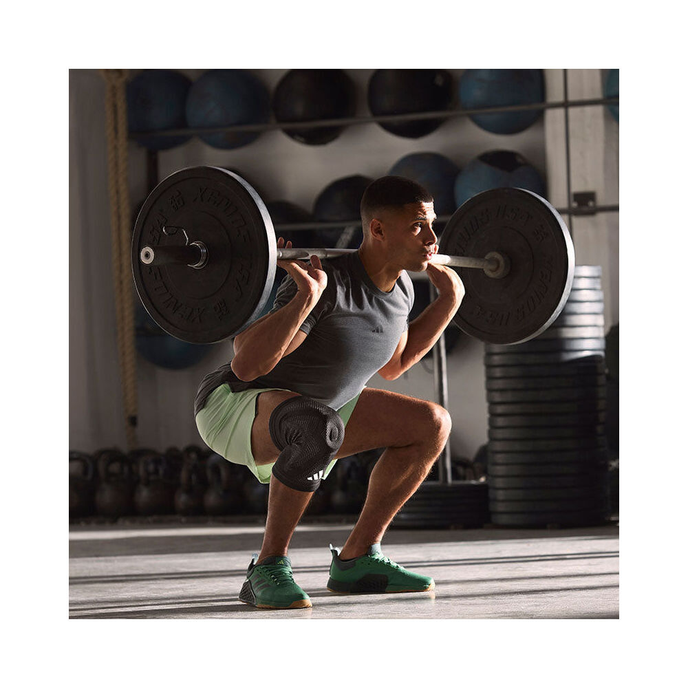 Constructed with innovative materials, it features a silicone patella ring for extra support around the kneecap and integrated fishbone supports for improved stabilisation. The Aeroready fabric wicks sweat away to keep you cool and dry, while strategically placed knit panels provide customised support and comfort. The ergonomic design contours to your knee, ensuring a secure fit with dotted silicone inlays that prevent unwanted movement. Thick cuffs at the top and bottom further enhance stability during intense activity.