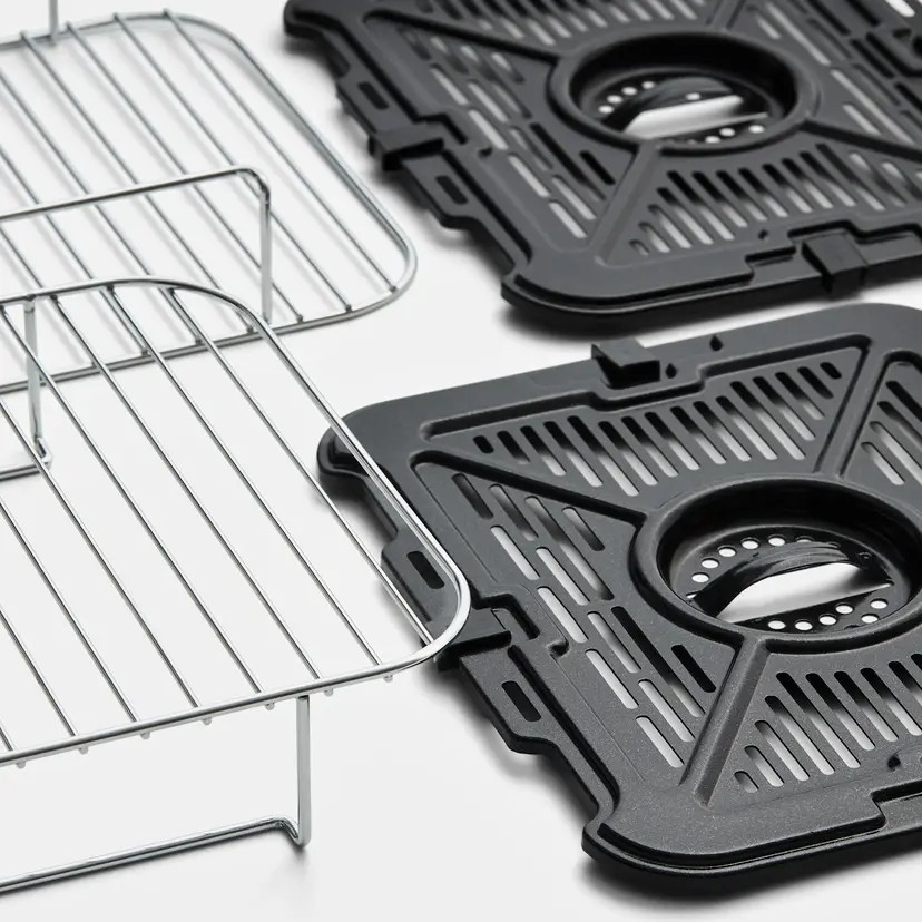 - Includes 1 x air fryer, 2 x ceramic non-stick crisping plates, 2 x stacked meal racks