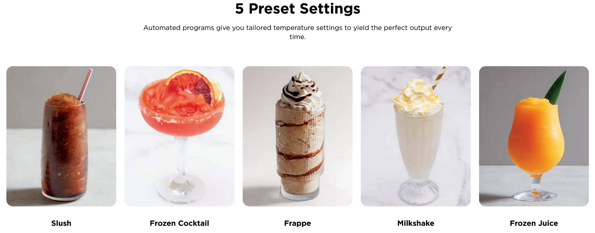 Automated programs give you tailored temperature settings to yield the perfect output every time. Slush, Frozen Cocktail, Frappe, Milkshake and Frozen Juice.