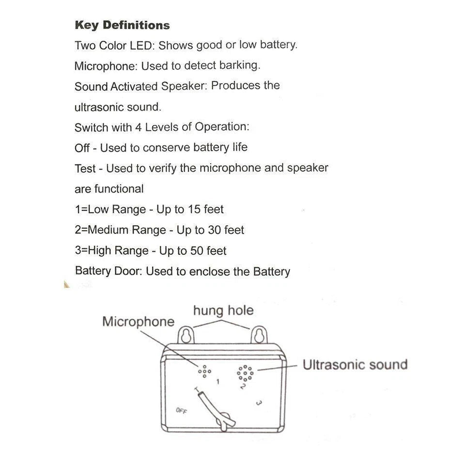 Stop excessive barking with this intelligent ultrasonic device designed for dogs of any size, six months and older. Using high-frequency sound technology, it effectively reduces unwanted barking within a 25-foot range, with detection capabilities up to 50 feet. Completely safe and humane, this professional-grade trainer works both indoors and outdoors. Easy to mount on trees, walls, or fence posts, it features a sensitive microphone that isolates and responds to barking sounds. Adjustable sensitivity levels let you start gently and increase as needed. Perfect for protecting your peace and your neighbours' comfort without any harm to your furry friend.